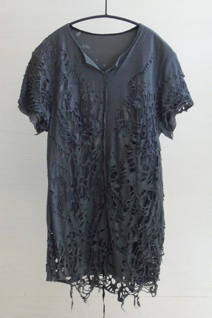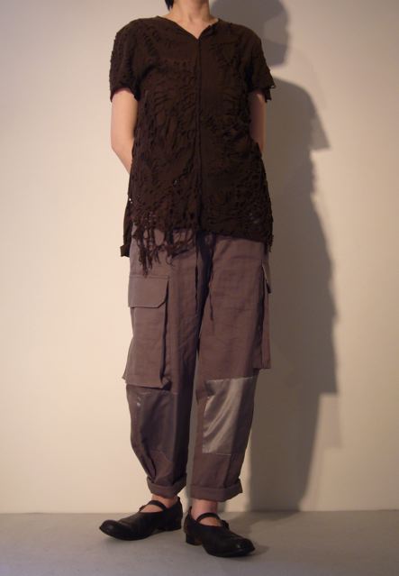 2010/5/24 volga volga 2010 S/S Collection volga volga 2010 S/S Collection ■ t-shirt cotton 100% col. gray , brown , black ¥35,700 (34,000) – sold out リバーシブルTシャツ 今シーズンvolgaのコレクションのメインでもあるハンドパンチングシリーズ 裏返すと裾や袖口からパンチングがちらっと見えるデザインになっている 存在感のあるマテリアルで主役になる一枚 ■ pant(droit fil) ¥21,000 (20,000) ■ trousers (HAIDER ACKERMANN) ¥126,000 (120,000)