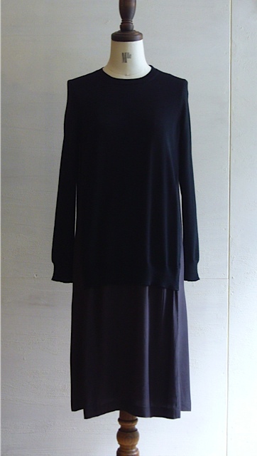 一見、セパレートをコーディネートしたようなニットとシルクのコンビネーションは、