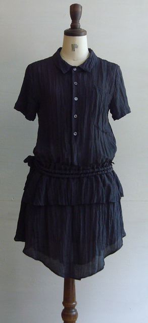 2011/6/26 LOKITHO 2011 S/S Collection LOKITHO 2011 S/S Collection ■ crash satin shirt dress polyester 77% / nylon 23% col. black size 2 ¥31,500 (30,000) – sold out サテンのような光沢感のあるふんわりとした素材感のシャツワンピ メンズライクなトップスに、女性らしいスカート部分のカットラインが特徴的 これからの季節にはラフに着こなしたい一枚