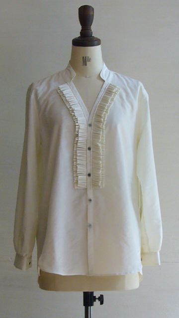 前開きのカットにVゾーンを作ることによって、柔らかいイメージを作り上げている