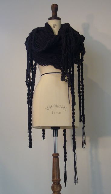 ツイストされた長い紐と蜘蛛の巣のように編まれたデザインは、