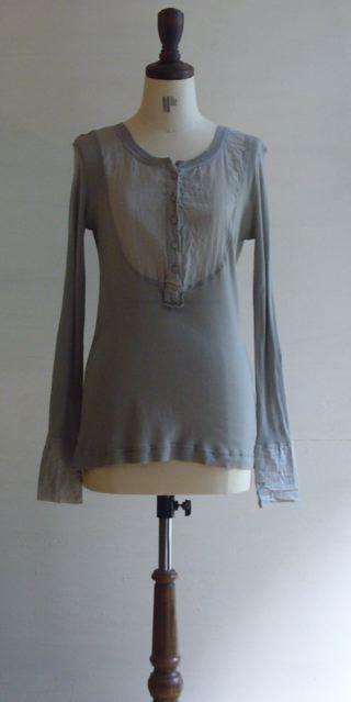 2012/2/11 KristenseN DU NORD 2012S/S Collection KristenseN DU NORD 2012S/S Collection ■ cut&saw cotton 100% col. grey , black size 2 ¥44,100 (42,000) – sold out 2種類のコットンで切替えられたヘンリーネックカットソー メンズライクなデザインも、着用すると女性らしい雰囲気になるのは クリステンセンならでは ジャケットのインナー等、シャツのような感覚で楽しみたい