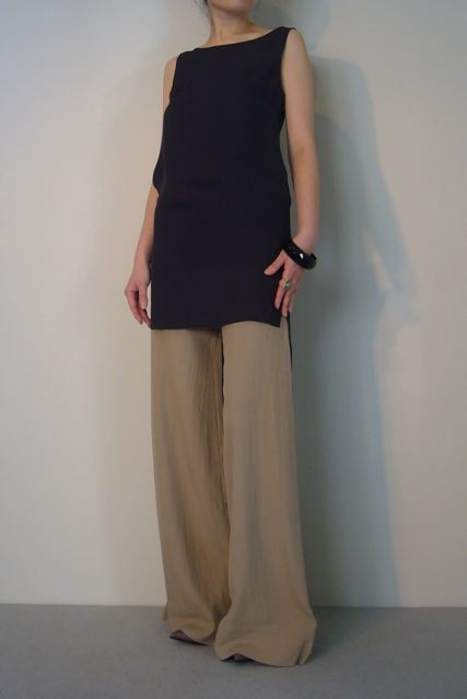 着丈のデザインを活かしてワイドパンツやロングスカートに合わせた、