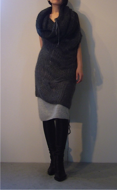 グレーのニットは裾に向かってトーンが明るくなるようグラデーションに編まれている