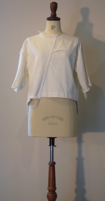 デニム生地をブロック状に縫い合わせたデザイントップス
